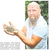 Manfred Gschwendtner weiß, wovon er spricht. Denn der Maschinenschlosser aus Sirnau ist seit über 20 Jahren Hobbyimker mit Leib und Seele, kümmert sich aktuell um 27 Völker und betreibt seit 2003 einen Lehrbienenstand im Esslinger Tierpark Nymphaea. Und nach 500 Stichen, erklärt der 1970 Geborene, spürt man so gut wie nichts mehr von einem Bienenstich. Dennoch rät er, auch die anderen beiden Grundregeln im Umgang mit den Insekten zu beachten – helle Kleidung und kein Parfüm. Wer doch gestochen wird, sollte den Stachel langsam mit dem Fingernagel aus der Haut herausschieben. Nicht drücken, sonst wird der gesamte Inhalt des Giftbeutels am Stachel in den Menschenkörper entleert.