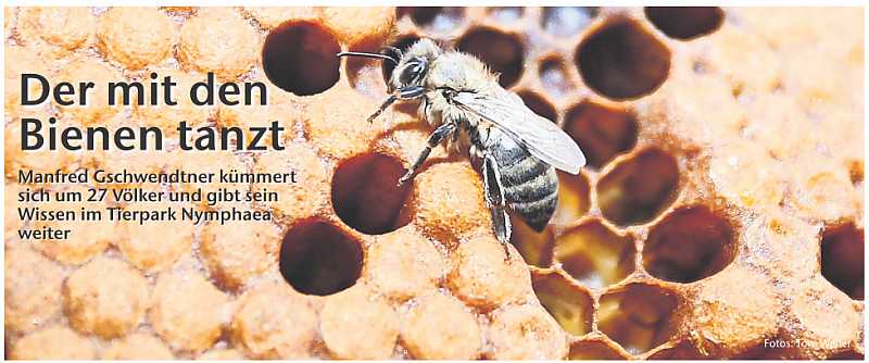 Manfred Gschwendtner unterhält einen Bienenstand im Esslinger Tierpark Nymphaea. An Infotafeln, einem Schaukasten und mehreren Stöcken können Besucher sehr viel über das Leben der Tiere erfahren. Der Bienenexperte ist nicht immer, sondern zu unregelmäßigen Zeiten anwesend. Dann jedoch beantwortet er gerne und ausführlich alle Fragen rund um die Imkerei. Alljährlich, meist am ersten Sonntag im Juni, lädt er zum Zuschauen und Mitmachen beim Honigschleudern ein. Mehr Infos zum Tierpark stehen unter https://www.tierpark-nymphaea.de/