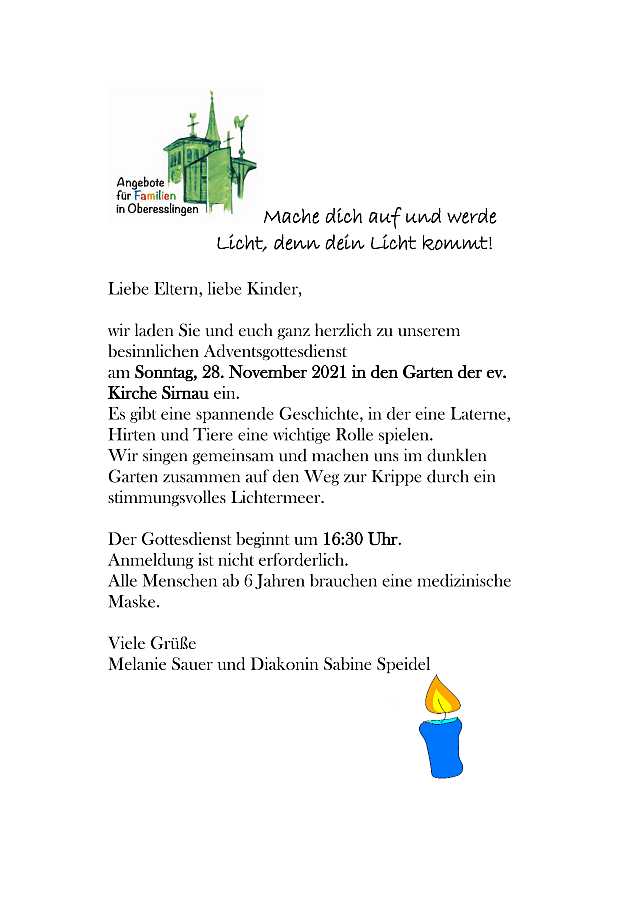 wir laden Sie und euch ganz herzlich zu unserem besinnlichen Adventsgottesdienst am Sonntag, 28. November 2021 um 16:30 Uhr in den Garten der ev. Kirche Sirnau ein.