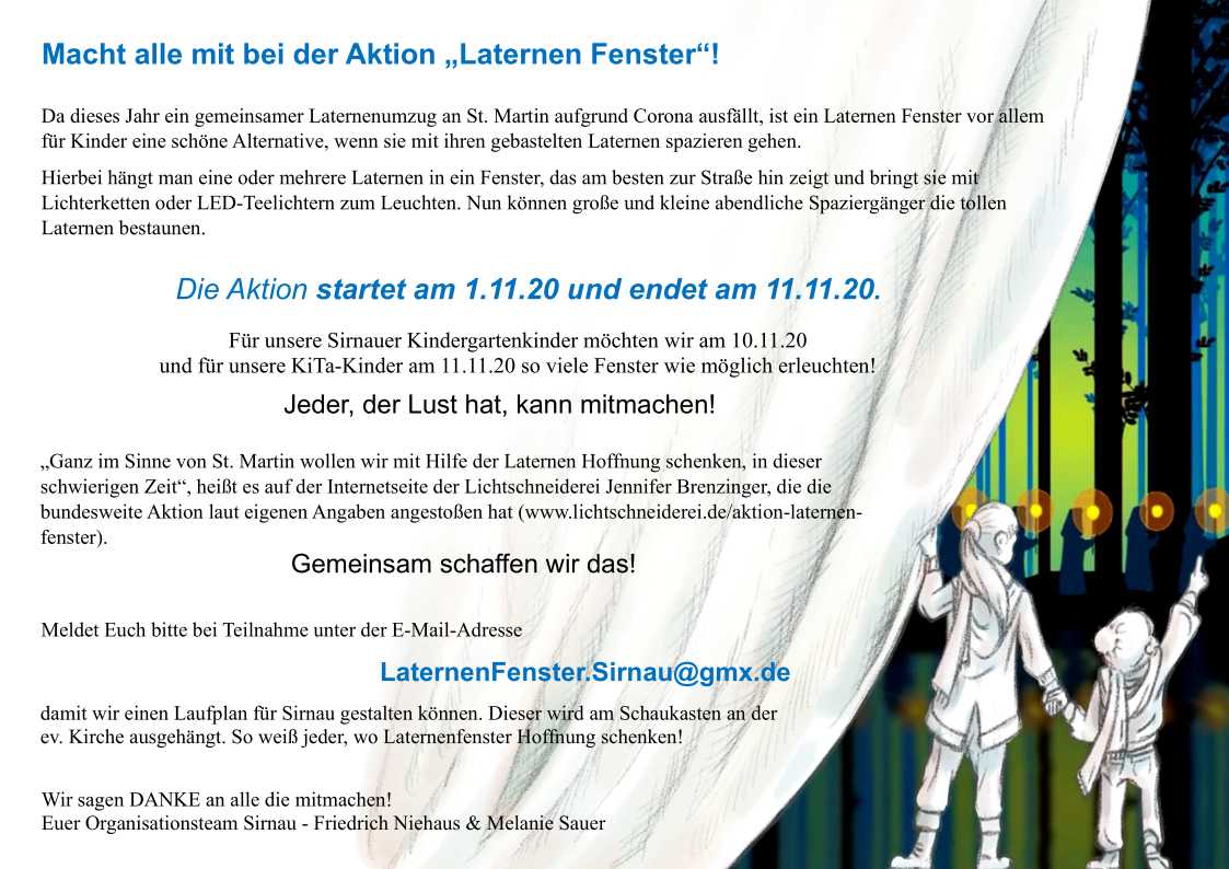 Für unsere Sirnauer Kindergartenkinder möchten wir am 10.11.2020 und für unsere KiTa-Kinder am 11.11.2020 so viele Fenster wie möglich erleuchten!