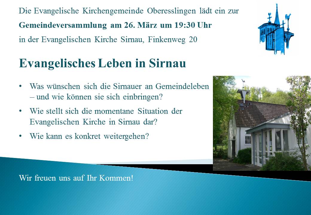Am Dienstag, 26. März 2019 um 19:30 Uhr findet eine Gemeindeversammlung in der Evangelischen Kirche Sirnau statt.